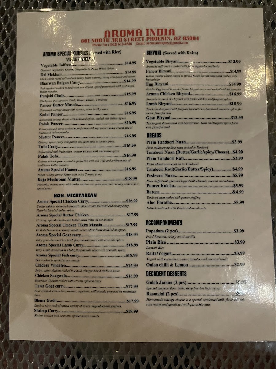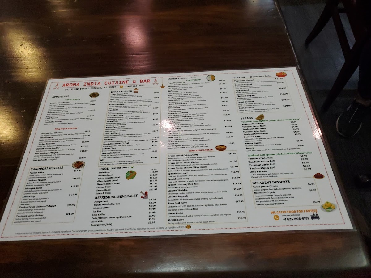 Welcome to Aroma India (Cuisine and Bar), a culinary gem nestled in the heart of Phoenix. This vibrant eatery skillfully combines authentic Indian flavors with a welcoming ambiance, making it a perfect spot for both seasoned food lovers and first-timers alike.